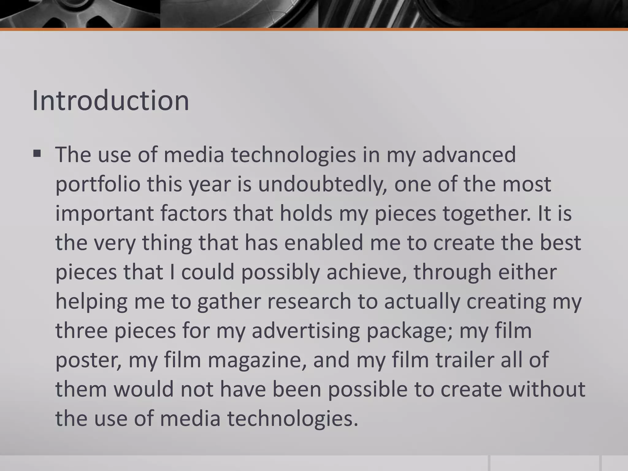 The document discusses the use of various media technologies throughout the creation of an advertising package for a film. In the research and planning phase, the author used the internet, survey monkey, blogger, prezi, cameras, and slideshare to gather information on the horror genre and target audience. During construction, cameras, iMovie, and Photoshop were used to shoot footage and create the film poster, magazine, and trailer. In the evaluation, prezi, blogger, google docs, and PowerPoint were utilized to present answers, gather audience feedback, and analyze the effectiveness of the pieces. Overall, media technologies played a crucial role in every stage of creating and evaluating the advertising package.