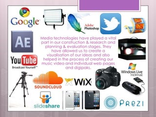 Media technologies played a vital role in the construction and research, planning, and evaluation stages. YouTube, Google, and Prezi were used for research purposes such as finding music videos to analyze, researching music theorists, and creating presentations. Planning was done using iPhones to take photos of work, WhatsApp for communication, and Facebook to find artist images. Photoshop and cameras were used to create digipaks and take photos. Wix and Photoshop built the website. A camera filmed the music video, which was then edited using Final Cut Pro and After Effects.