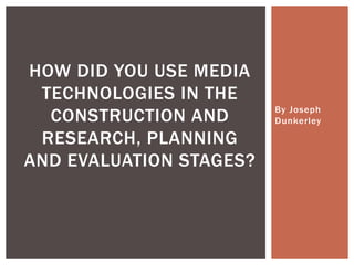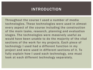 The document discusses the various media technologies used by the author at different stages of their course project. Throughout construction, research, planning, and evaluation, the author utilized tools like Blogger to create their blog, Slideshare to upload presentations, Facebook for communication, Sony Vegas and Serif Movieplus for video editing, Google Chrome and Internet Explorer for research, a Canon camera for filming, YouTube to upload videos, Cinema 4D and Photoshop for graphics/animation, Audacity for audio editing, and Flash for creating a diagram. Each technology served a specific purpose and allowed the author to complete different elements of their project.