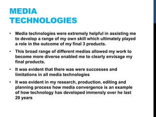 The document discusses how various media technologies were used at different stages of creating a music video and ancillary products. Technologies like the internet, YouTube, Vevo, Google, printed magazines, a DSLR camera, Adobe Premiere, Blogger, and Slideshare were used for research, production, editing, and distribution. The document evaluates the successes and limitations of each technology and how they helped produce high quality final products while demonstrating media convergence.