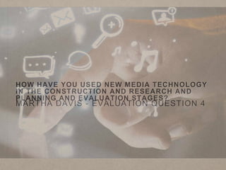 This document discusses Martha Davis' use of new media technology throughout the construction, research, planning, and evaluation stages of a media project. Some of the key technologies used include Google for initial research, Blogger for recording work, YouTube to analyze examples, Photoshop and Premiere for construction, Keynote and Prezi for evaluations, and SoundCloud to host audio recordings. New media was crucial for inspiration, development, and sharing of the final work.