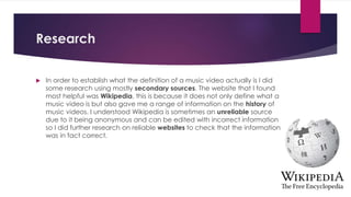 1) The student researched music videos using secondary sources like Wikipedia and online articles. They watched existing music videos on YouTube for inspiration.