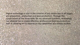 Chrissie Bishop used various digital technologies and media at different stages of her media project. During planning and research, she used the internet (particularly her blog), Microsoft PowerPoint, Prezi, and YouTube to gather and organize her ideas. For production, she used professional lighting and a Canon DSLR camera to film high quality footage. In post-production, she edited her music video using Adobe Premiere Pro and Photoshop to add effects, color correct, sync audio, and design packaging graphics. Overall, digital technologies were essential in creating her final media products and improving her skills as a media student.