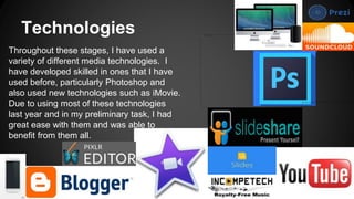 Throughout the project, the student used various media technologies including iMovie, Photoshop, Pixlr Editor, a Mac computer, SD card, YouTube, Incompetech, Slideshare, Blogger, Soundcloud, Prezi, a Panasonic HD camera, and tripod. These technologies were effective in constructing, researching, planning, and evaluating the different stages of the project and helped produce high quality final products and presentations. The technologies worked best when used together to complement each other.