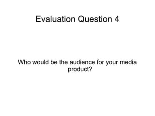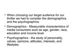 The document discusses evaluating the target audience for a thriller media product. It examines both demographics and psychographics to determine the ideal viewer. Research showed that people aged 16-20 were most interested in a thriller based on a survey. Therefore, the target audience for the thriller discussed would be males aged 16-24, as horror films tend to attract more males. The product would also target social grades C and below since lower class people tend to watch more horrors. Relatability to characters from a similar age and social background factored into defining the target audience.