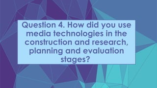 During the research, planning, construction, and evaluation stages, the student relied heavily on digital technologies and online platforms. For research, they used Google search, Google Images, YouTube, and their iPhone. They created online surveys using Survey Monkey to collect audience feedback. They designed their digipak and poster using Photoshop and Gimp on their computer and shared them on Facebook to collect more feedback. They filmed their music video using a Canon DSLR camera and edited it using Final Cut Pro. They presented their final products and evaluations using online presentation platforms like Prezi, SlideShare, and Emaze. They uploaded all their work and research to a Weebly blog to track their progress.