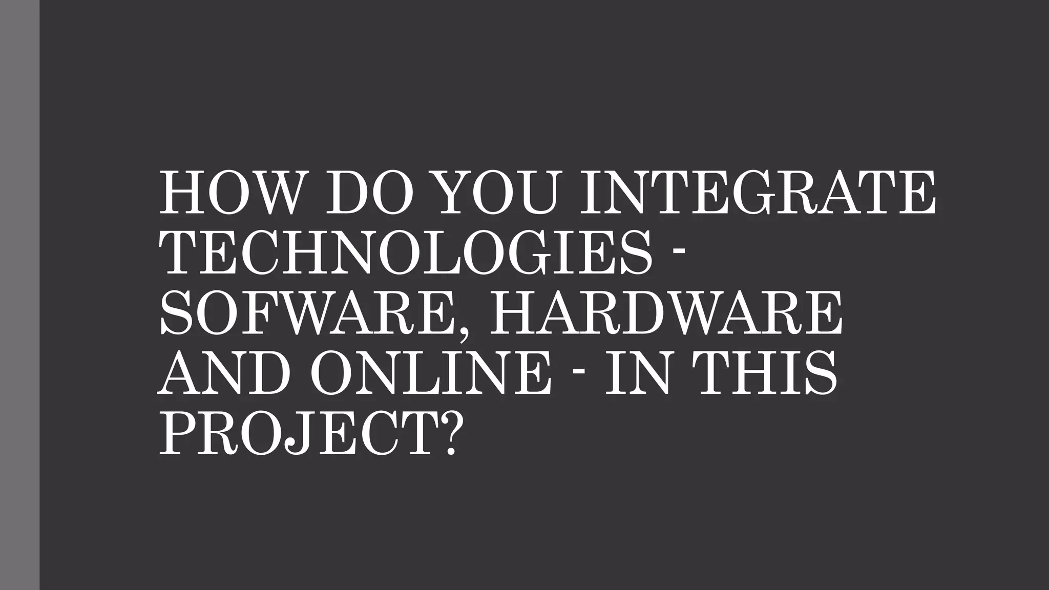 This project utilizes various technologies including software, hardware, and online resources. Software such as PowToon, Prezi, PowerPoint, and Notepad were used to edit videos and create presentations. Hardware like cameras was used to record video trailers. Online platforms like YouTube and Wix were employed to publish and share the project videos and website.