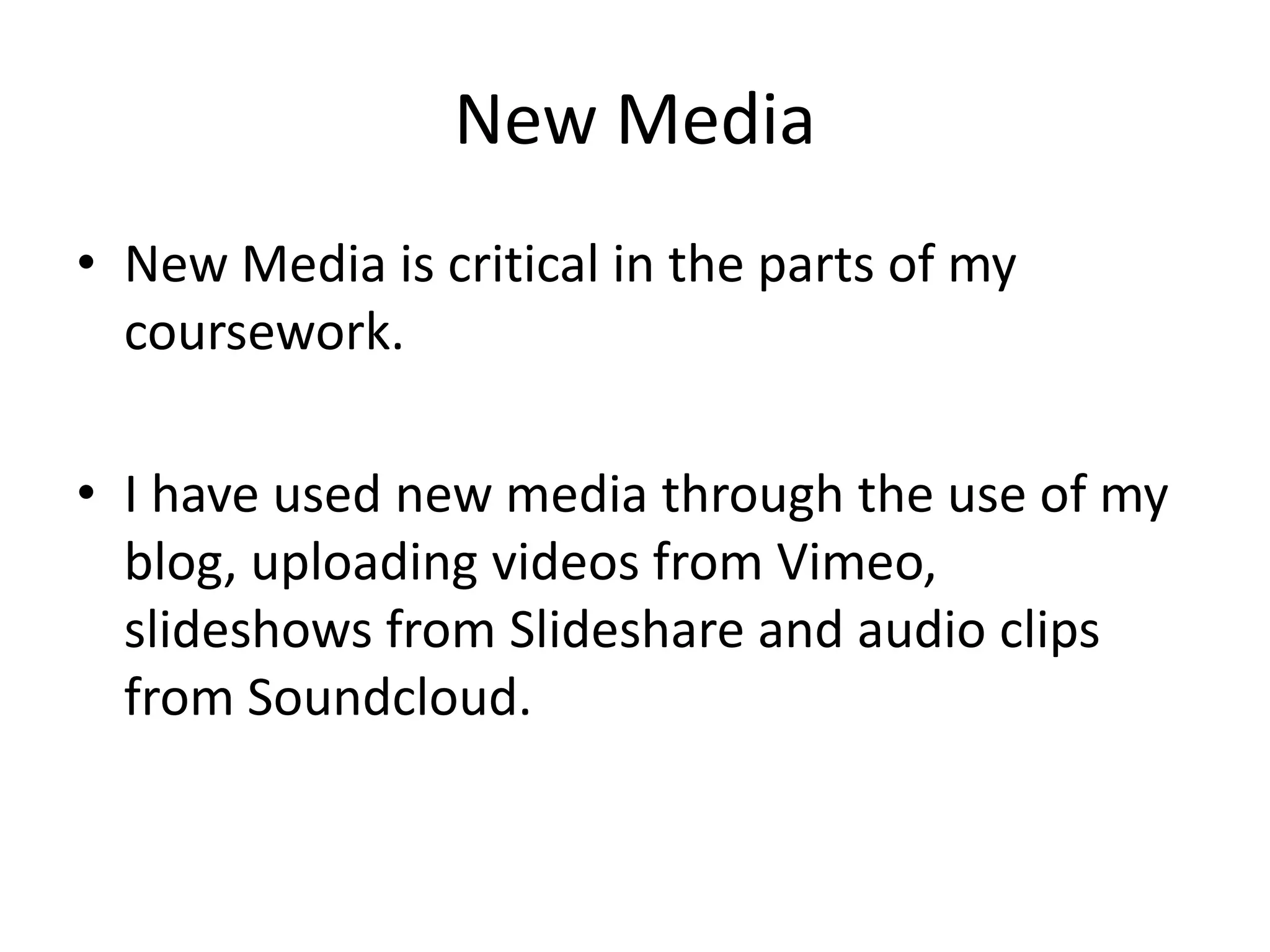 The document discusses the various media technologies used at different stages of the coursework process. At the research stage, Google, YouTube, Vimeo, Microsoft Word, and PowerPoint were used. PowerPoint and Word were also used for planning and construction. Photoshop, iMovie, GarageBand, and InDesign were the main technologies used for constructing the magazine, poster, and trailer. Vimeo, SoundCloud, PowerPoint, and SlideShare were utilized for evaluation by uploading videos, audio, and presentations to blogs.
