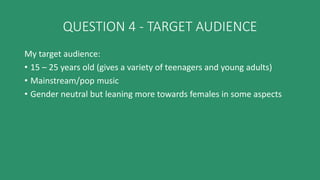 The target audience for the media product is 15-25 year olds who enjoy mainstream/pop music. The audience is gender neutral but may appeal more to females. To attract this audience, the creator formed a focus group on social media of people fitting the target criteria. Every idea and change to the product was discussed with the focus group and polls helped decide aspects. The focus group provided helpful feedback to design a magazine that would appeal to the intended target audience of young music fans.