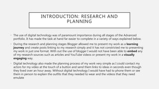 Digital technologies played an integral role throughout the construction, planning, research, production, distribution, and evaluation of the author's advanced portfolio. During planning, blogger allowed research to be presented engagingly and contacts to be easily made. iMovie and Photoshop were crucial for editing video and images efficiently. Vimeo and Google Forms facilitated distribution, feedback, and evaluation. Overall, technologies enabled swift completion and sharing of the portfolio in multimedia formats to a broad audience.