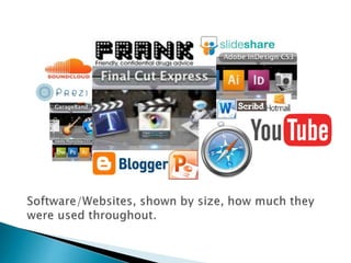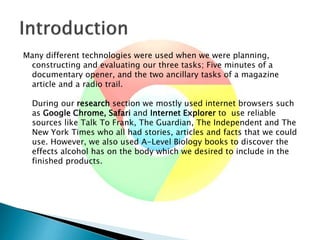 The document describes the various technologies and tools used to plan, create, and evaluate three media projects: a documentary opener, magazine article, and radio trail. During planning, online research was conducted using search engines and news sites. Storyboarding, scripting, and drafting were used to develop concepts. Video and audio were recorded using cameras and microphones, and footage was edited in Final Cut Express. A magazine article was designed in InDesign. Projects were evaluated through blog posts, slideshows, and videos uploaded to online platforms like YouTube and Slideshare.