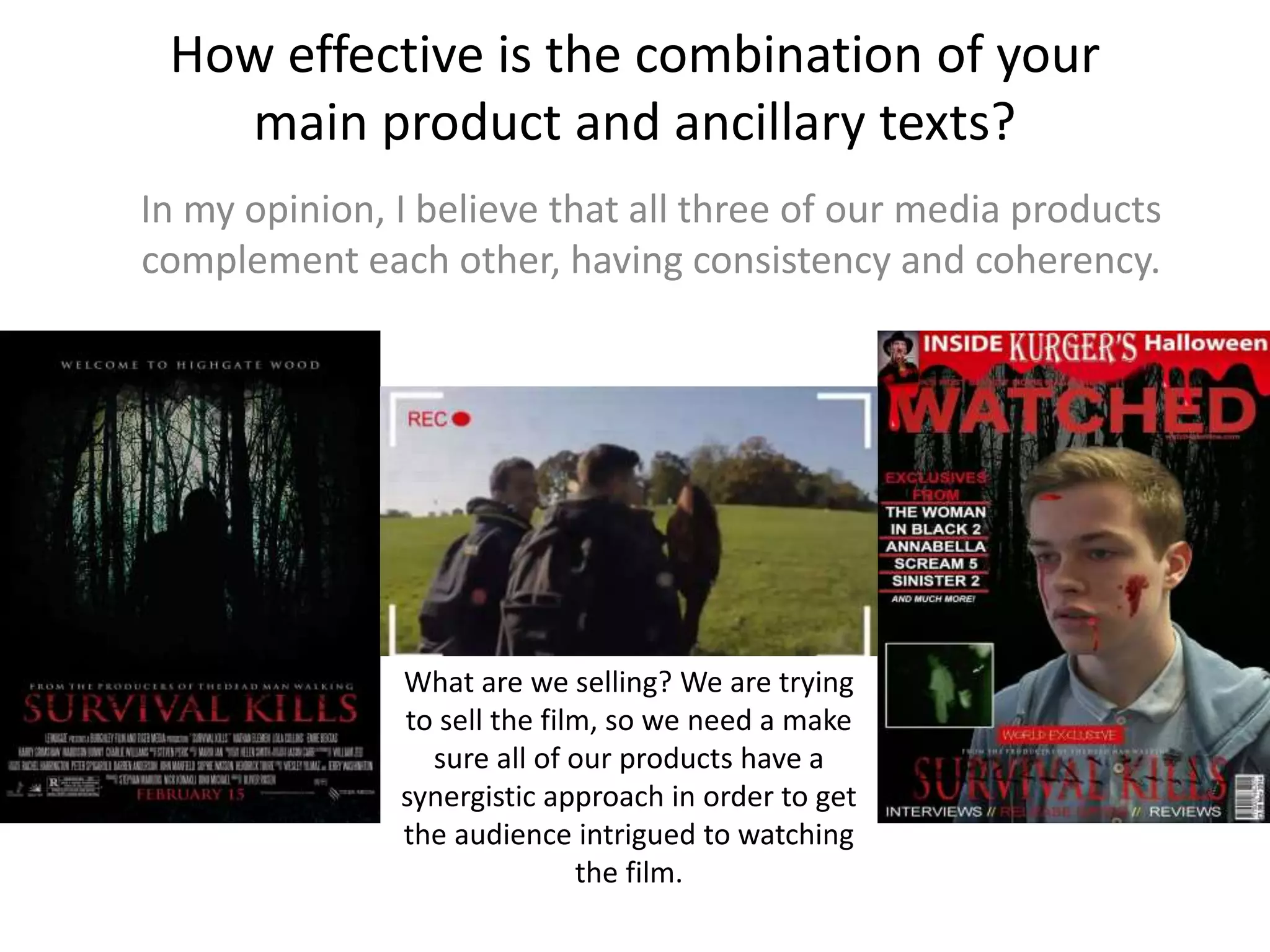 This document discusses a marketing campaign created for a horror film that focused on consistency across three media products: a movie poster, magazine cover, and trailer. Key elements like location, characters, and typography were emphasized synergistically. The woods location was prominently featured in all products using similar backgrounds. While the killer's identity was kept mysterious, the same character appeared in the magazine cover and trailer. Identical font styles and taglines linked the products. Taken together, the campaign was intended to intrigue audiences and promote the film in a coherent way across different media.