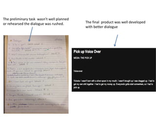 The preliminary task was not well planned and had limited shot types, whereas the final product was well developed with different shot types and better dialogue. Through completing the preliminary task, the group learned how to use video editing software and work as a team to effectively apply those skills to produce a higher quality final product with edited scenes and additional effects.