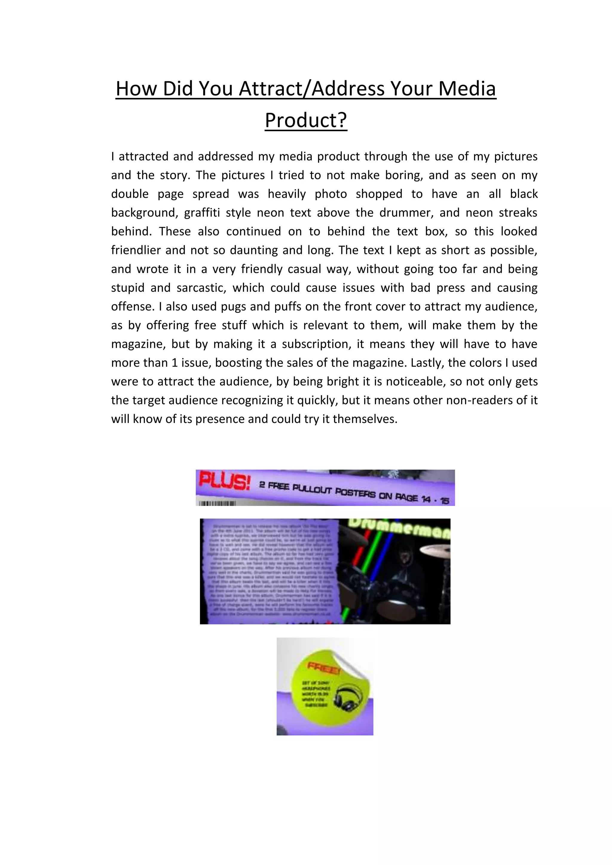 The media product was addressed through colorful and edited photos along with short, casual text. Pictures on the double page spread had a black background with graffiti-style neon text over the drummer and neon streaks behind to look friendly rather than daunting. Free promotional items related to the target audience, like pugs and puffs on the front cover, were used to attract buyers to subscribe and boost multiple issue sales. Bright colors were also used to make the product noticeable and attract both the target readers and potential new readers.