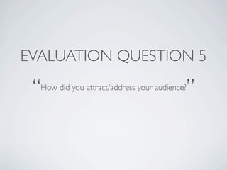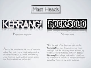 The document discusses the strategies used to attract and address the target audience in the creation of a magazine, comparing it with the style of Kerrang!. Key elements include the use of similar masthead designs, color schemes, and the depiction of musicians to appeal to a rock audience. Additionally, it highlights the importance of layout, font usage, and promotional elements like free items to enhance audience engagement.