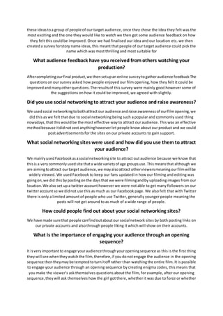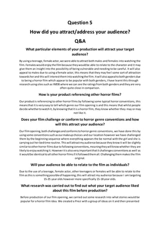 The document discusses how the filmmakers attracted their target audience of 15-25 year olds, particularly 15-18 year olds, to their horror film opening. They used a teenage female actor to appeal to both males and females. Research showed horror appeals to both genders. The opening both followed and challenged horror conventions to attract audiences familiar with the genre but also offer some originality. Social media, particularly Facebook, was used to promote the film and engage audiences by sharing production updates and images. An engaging opening sequence with unanswered questions was important to attracting audiences to watch the full film.