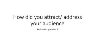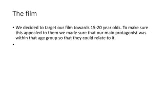 The document discusses how the filmmakers targeted and addressed their audience of 15-20 year olds. They made the main protagonist within this age range to make the film relatable. Simple and minimalist design was used for the logo and title to focus attention. Tense music and an ambiguous ending title sequence were used to keep the audience watching. Establishing shots were filmed with a drone to contrast horror stereotypes and intrigue viewers without revealing the plot. Mystery is built around doors and what lies beyond them to engage the audience.