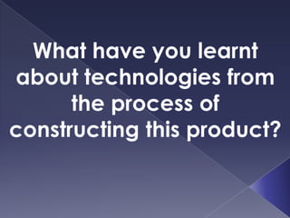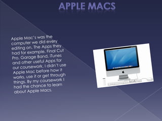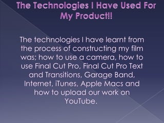 The document discusses various technologies the author has learned to use for a film coursework project, including a Sony Bloggie camera, Final Cut Pro editing software, Garage Band music software, iTunes, and the Safari web browser on Mac computers. It describes learning how to use each tool effectively, such as zooming and stabilizing footage with the camera, editing video clips and adding transitions and sound effects in Final Cut Pro, creating soundtracks in Garage Band and transferring them to Final Cut Pro via iTunes, and using Safari to download additional resources on Macs.