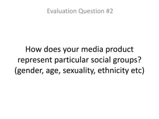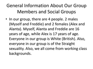 This document discusses how social groups are represented in the media product. It notes that the group consists of 2 males and 2 females, all aged 16-17, white and straight.