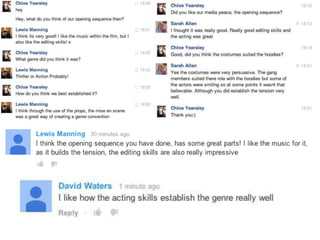 This document discusses what was learned about technologies from constructing a product. A film opening sequence was created and audience feedback was collected through an online questionnaire to evaluate it. Various computer software like Microsoft Word and Excel were used to design the questionnaire and analyze the feedback. More questions could have been included and additional technology skills developed to improve the opening sequence and gather a wider range of responses from the target audience.