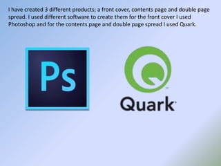 The document discusses what technologies the author has learned about through creating three magazine products. They used Photoshop to design the front cover, learning tools like the lasso and how to add effects. For the contents page and spread, they used Quark Xpress, finding it more difficult than Photoshop but learning how to import and resize images and text. They also discovered how to create drop caps in Quark to indicate where articles start on spreads.