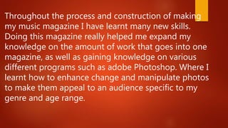 Throughout constructing a music magazine, the author learned about various technologies. They gained knowledge of programs like Adobe Photoshop and learned how to enhance, change, and manipulate photos for their intended audience. The author used new programs like Blogger and SlideShare, which allowed them to upload content like PowerPoint presentations. They also used a Canon camera to take high quality photos for the magazine and learned photography skills like adjusting brightness and zoom. When making the magazine, the author applied their understanding of programs like Adobe Photoshop and InDesign to professionally alter images and layout the double page spread.