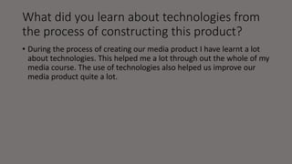The document discusses the technologies used and lessons learned during the process of creating a media product. The key technologies discussed are cameras, tripods, the internet, blogger, and slideshare. The author learned how to properly use and position cameras on tripods to avoid accidents. Blogger and slideshare provided easy ways to organize work online and embed different file types. Overall, working on the media product helped the author gain technological skills that will be useful for future media courses.