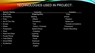 The document summarizes various technologies used during the different stages of constructing an opening title sequence (OTS) project. It discusses technologies used for research and planning like blogs, PowerPoint, Pearl and Dean website. Technologies used for construction included Final Cut Pro for transitions, text, blading, focus, and layering. Technologies used for evaluation included Prezi, screen recording software, and YouTube annotations. Each technology is explained alongside an example of its use in the project.