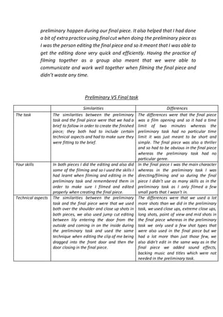 - Completing the preliminary task helped the student learn filming skills like shot types and continuity rules that they applied to successfully film and edit their thriller opening for the final project.