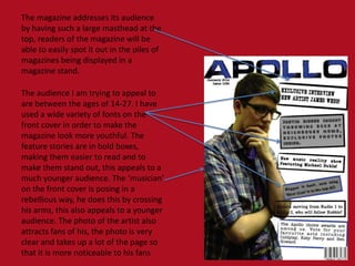The magazine targets an audience aged 14-27 by using a variety of fonts on the colorful front cover to appear youthful. Feature stories are highlighted in bold boxes to stand out and appeal to younger readers. The musician on the cover is posed rebelliously with crossed arms to attract fans. The informal, relatable language draws in the target audience rather than feeling like a lecture. Mainstream music topics and charts help readers feel connected to popular culture. A quirky thought bubble from the artist adds humor that young people would appreciate.