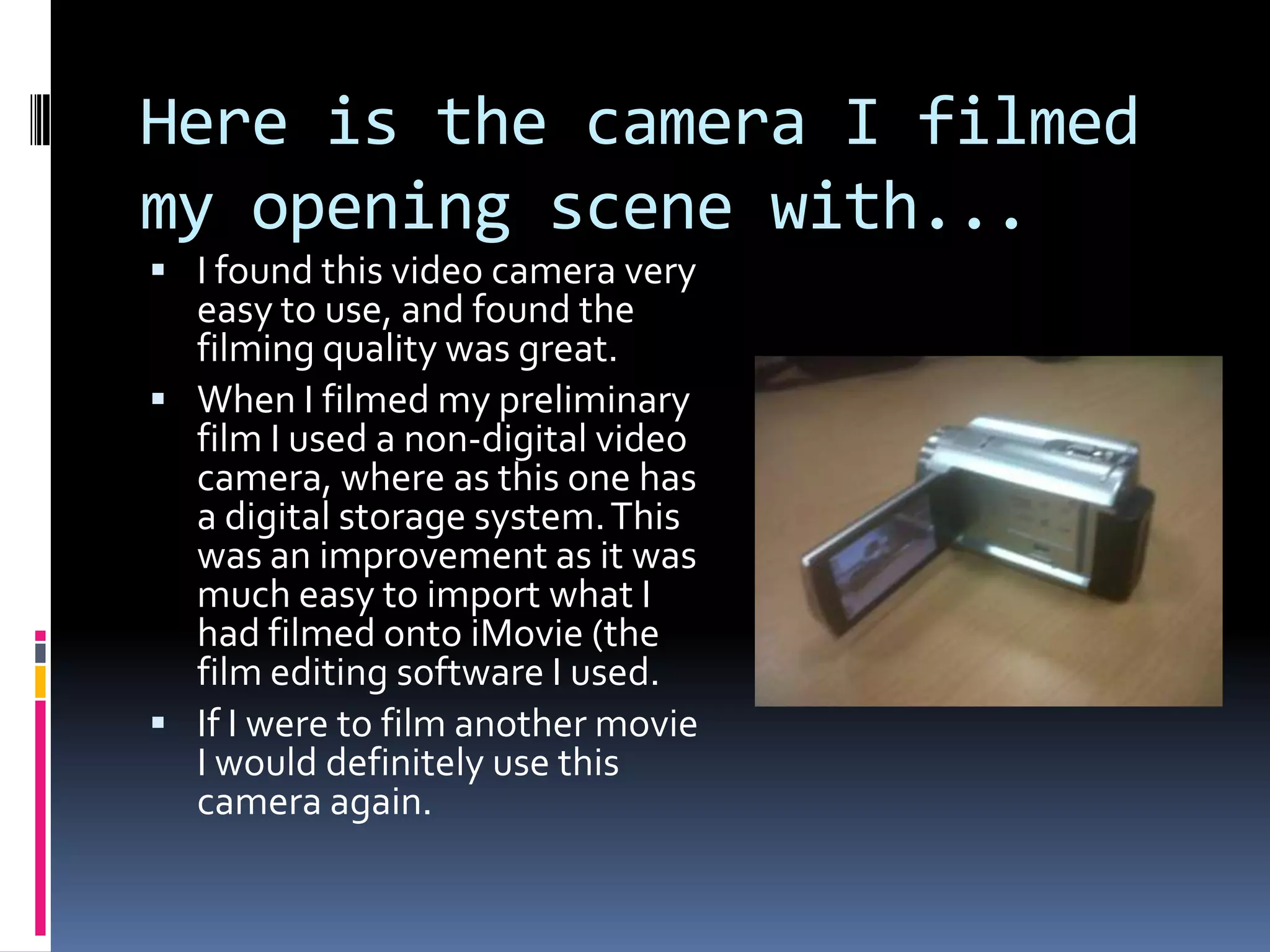 The document summarizes the technologies and equipment used to create an opening movie scene, including a digital video camera, tripod, iPod Touch prop, Apple Mac computer, and iMovie editing software. The camera provided good filming quality and was easy to import footage to iMovie. The tripod helped keep the camera stable. iMovie was initially challenging but became easier with practice, allowing the creator to learn editing techniques like adding sound, arranging clips, adding text and transitions.