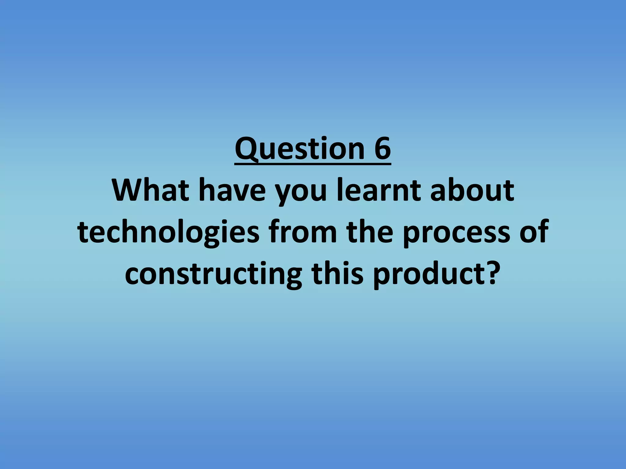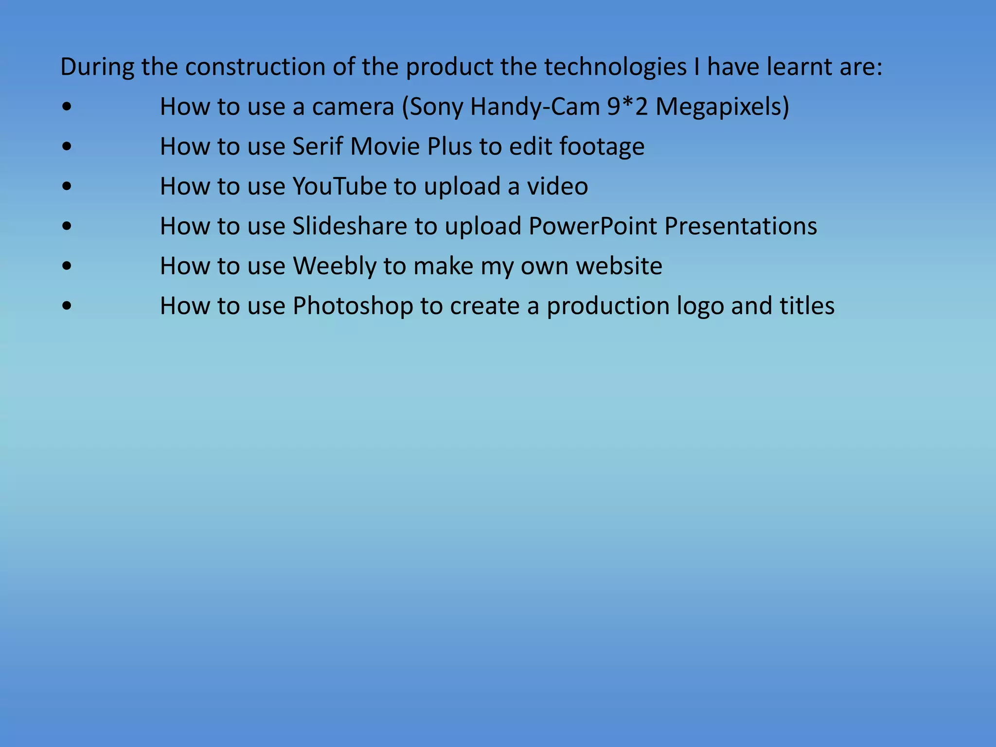 I have learned several technologies from creating this product including how to use video editing software like Serif Movie Plus and cameras. With Serif Movie Plus, I learned how to import and trim clips, speed up footage, and use pans and zooms. I also learned how to upload videos to YouTube and presentations to Slideshare, and how to create a website using Weebly to display my work. Additionally, I learned how to use Photoshop to create a production logo and film titles, including editing text styles and images.