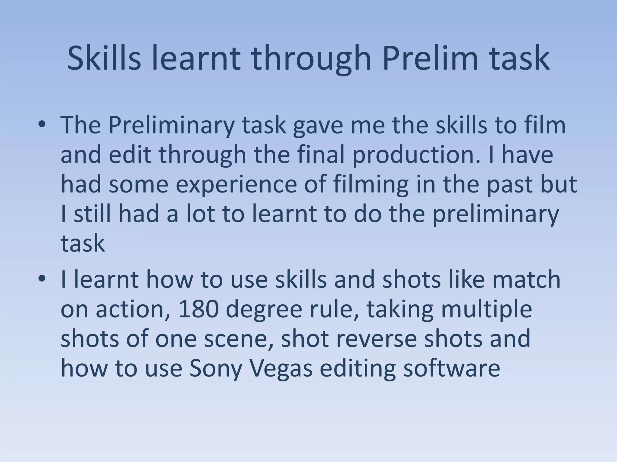 The preliminary task taught the student important filming and editing skills like match on action shots, 180 degree rule shots, and using Sony Vegas editing software. These skills helped make the final production look more polished with varied shots. Specifically, the preliminary task experience helped with acting, using equipment, and understanding when to use certain shots to set mood. It also showed the importance of capturing scenes from multiple angles to aid the editing process. Overall, the preliminary task built the student's confidence and skills for a successful full production.