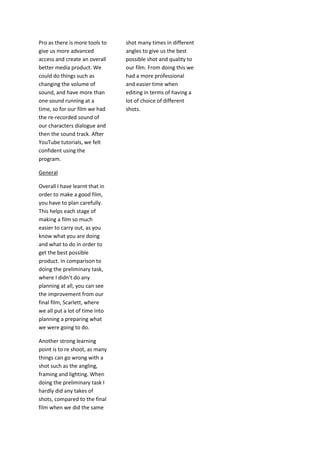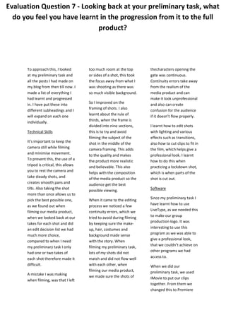 The document summarizes what the author learned from their preliminary task to their full media product. They discuss improvements in technical skills like using a tripod, taking multiple takes, better framing shots, and avoiding continuity errors. They also learned to use new software like LiveType and Premiere Pro which allowed for more advanced editing. Overall, they learned to carefully plan, reshot scenes from different angles, and that planning and preparation leads to a better final product.