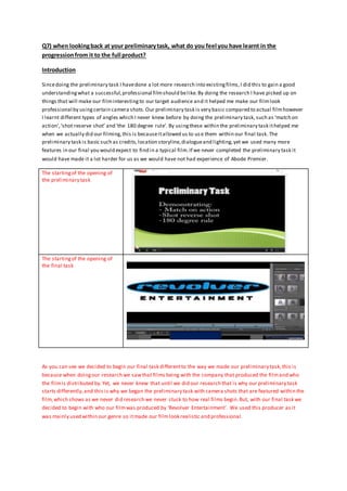 - The author learned a lot from completing the preliminary task and doing further research on film techniques and conventions, which helped improve the quality and professionalism of the final film. Some of the key things learned and improved included understanding how to properly frame shots, include establishing shots of locations, and follow traditional conventions for how films begin and progress.
