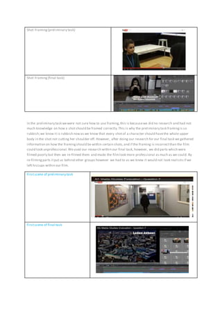 - Specific examples are provided of how shots, scenes, and other elements were improved upon from the preliminary to final task by applying techniques learned from research, such as adding establishing shots of locations to provide context. The preliminary task provided valuable hands-on experience with filming techniques to build upon for the higher quality final product.