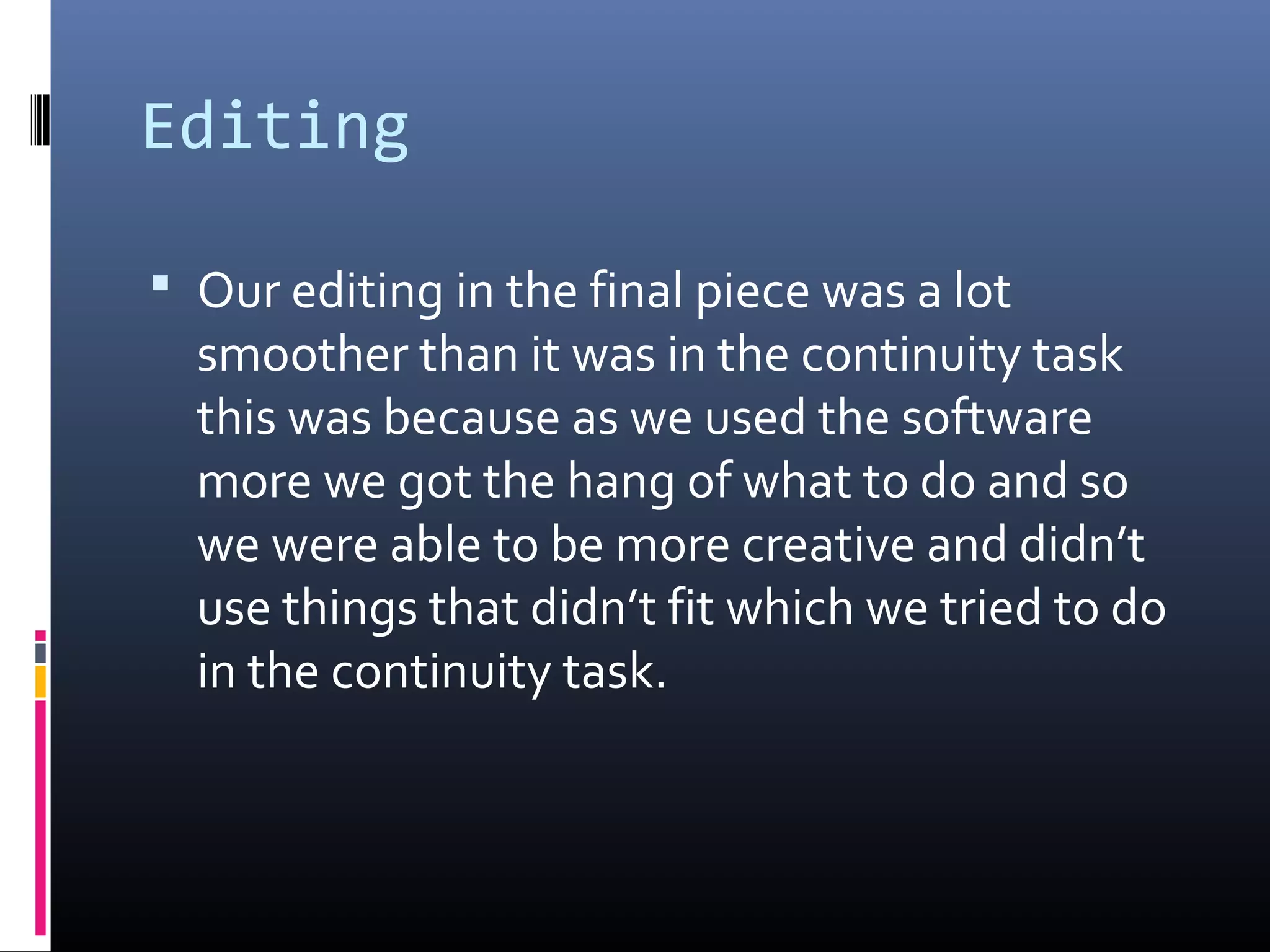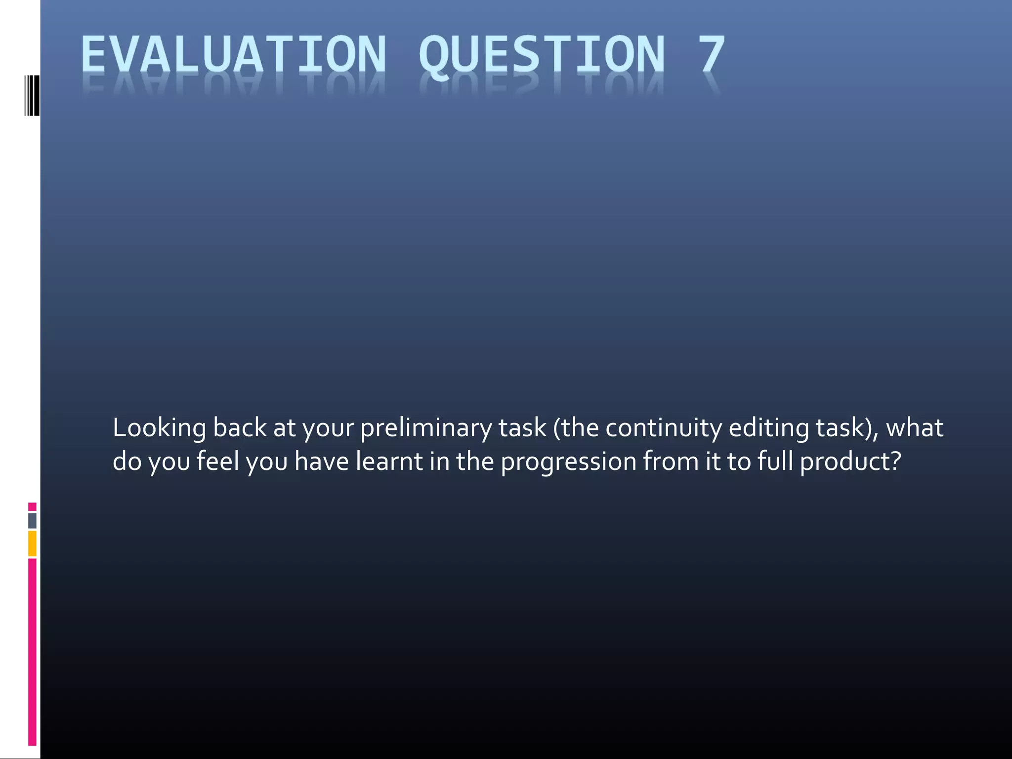 The document discusses the learning process from a preliminary editing task to a final product. It notes that the editing in the final piece was smoother because more practice with the software led to being more selective about effects. Examples show unnecessary effects were used in the preliminary but not the final piece. More shots like close-ups and point-of-view shots were used in the final compared to over-the-shoulder shots in the preliminary. The document reflects on learning to make editing smoother between frames, including more shots for coherence, and only using effects like sharpness when needed for the story.