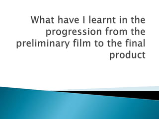 The document discusses the author's experience making a preliminary film and subsequent final product. For the preliminary film, the author lacked planning and storyboarding skills and did not understand important concepts like framing, mise-en-scene, and editing. For the final product, the author improved their skills in planning, camerawork, mise-en-scene, editing, collaboration, and time management. Overall, the author gained valuable experience and developed many new skills in film production from the preliminary film to the final product.