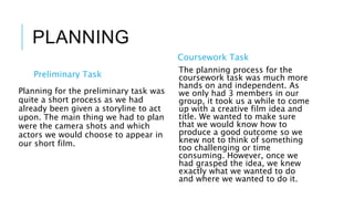 Jamey reflects on learning key skills from their preliminary task and full coursework film project. Planning was easier for the preliminary task as it had a given storyline, whereas the coursework required more independent planning. Storyboarding, camera skills, mise-en-scene, editing, sound, and titles were all areas that Jamey gained experience in through both projects. Teamwork and independent learning were also important skills developed. Overall, Jamey feels they have learned a great deal about film production across both tasks but could improve their time management.