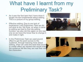 The document discusses what was learned from completing a preliminary editing task and how those skills were applied to a later full project. Specifically: