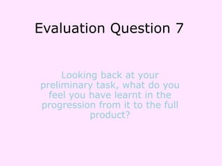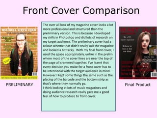 The document discusses the improvements made from the preliminary magazine project to the final product. For the front cover, the person learned to make design decisions intentionally with the target audience in mind. They also gained experience with Photoshop and conducting audience research. For the contents page, multiple subheadings and improved Photoshop skills allowed for better use of space. Audience research also informed additions like social media information. Overall, the person learned the importance of intentional design, audience research, and developing Photoshop skills for magazine layout.