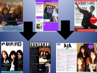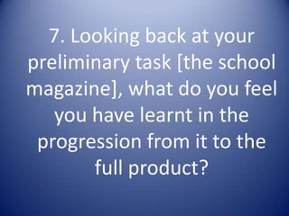 The document discusses the learning and improvements the author has experienced from an initial school magazine project to developing a full music magazine product. Some of the key lessons learned include gaining more confidence with design software like Photoshop, improving editing skills, learning about magazine conventions, and understanding magazine distribution. The author's design work for the music magazine is seen as more professional compared to the initial school magazine, with stronger use of layout, images, and typography. Overall, the preliminary school magazine project helped the author gain experience that improved the quality of their subsequent music magazine design work.