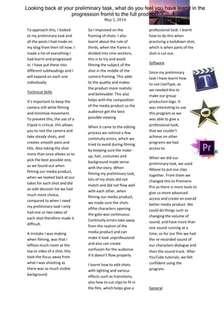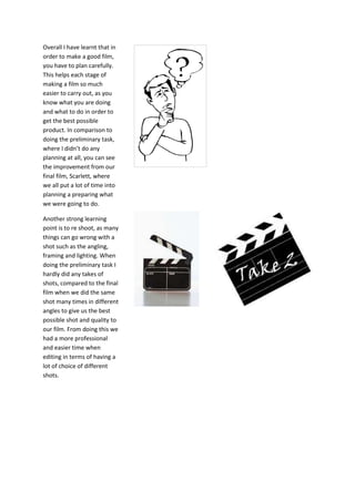 The document discusses the author's learning and progress in technical skills, software skills, and general filmmaking skills from an initial preliminary task to subsequent work. Some key lessons learned were: using a tripod and taking multiple takes improves shot quality; proper framing and following the rule of thirds enhances composition; maintaining continuity is important; and planning and reshoots are critical for a high quality final product. The author also learned to use editing software like Premiere Pro and design software like LiveType.