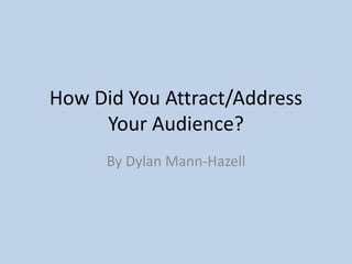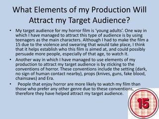 The document discusses how the author attracted their target audience of young adults to their horror film. Some key elements included using teenage main characters, sticking to horror conventions like isolated settings and weapons, and referencing the "fear of the unknown" through an unknown texter. The author promoted the film on social media like Facebook and informally engaged their audience. Audience feedback provided both quantitative and qualitative data. The opening engaged the audience with unanswered questions to keep them interested.