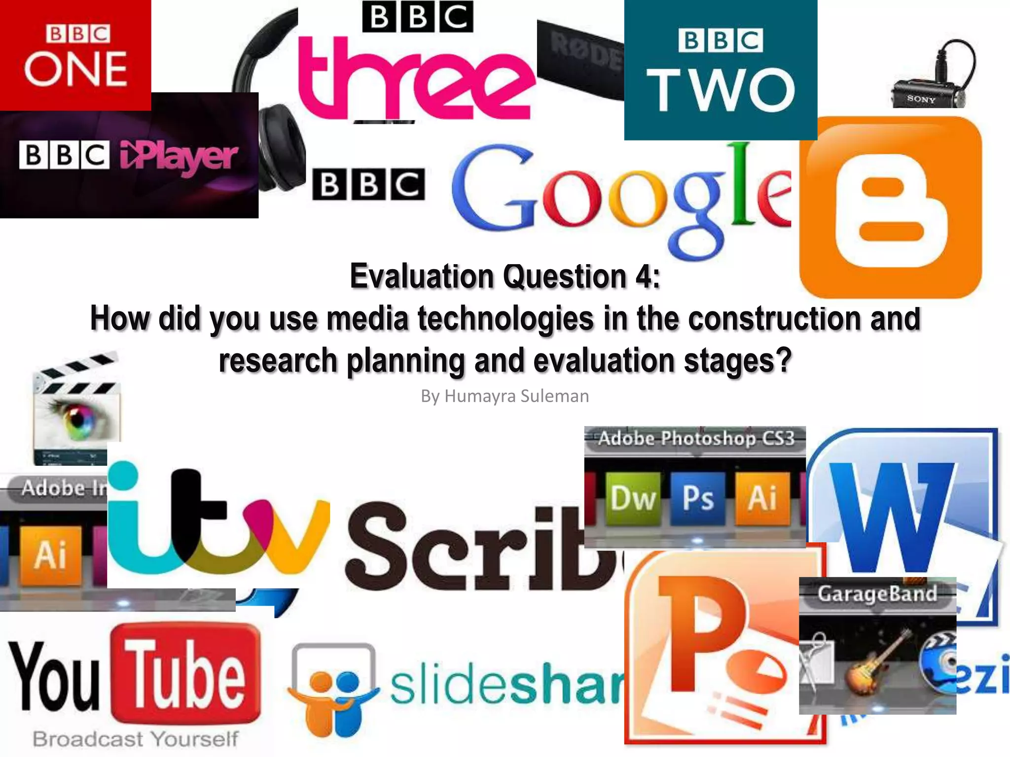The document discusses the various media technologies used during the research, planning, and evaluation stages of creating a documentary and related products. Google, BBC websites, YouTube, and iPlayer were used for initial research. Microsoft Word was used for planning questionnaires, schedules, and sharing documents. A Canon camera, tripod, shotgun microphone, and headphones were used for filming. Final Cut Express was used to edit footage, add effects and transitions. Garageband was used to create original music. Blogger, Scribd, and Slideshare were used to upload and share documents. PowerPoint, Word, Prezi, and embedded videos were used to evaluate different aspects of the process.