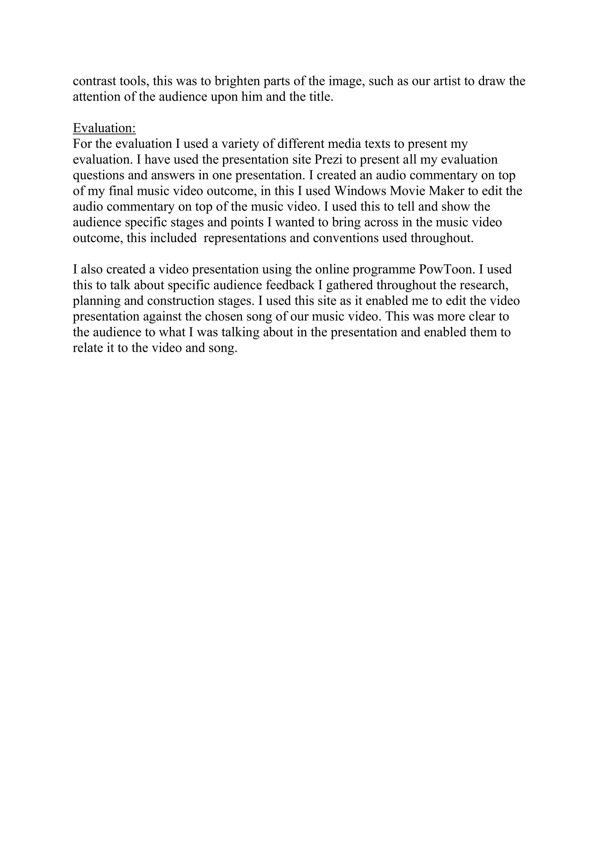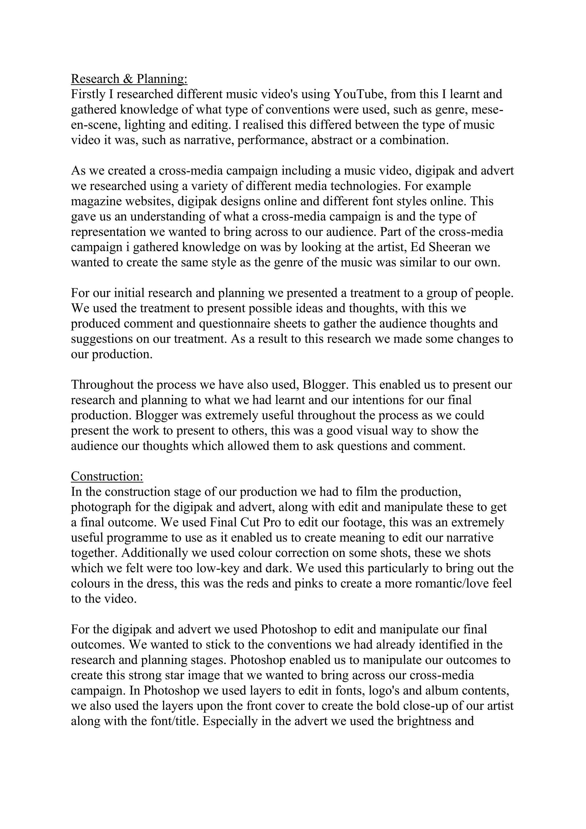 The document outlines the process of creating a cross-media campaign, including a music video, digipak, and advert, highlighting the research on music video conventions and audience feedback. It details the construction phase, where filming, editing using Final Cut Pro, and design with Photoshop were utilized to align with identified conventions. Lastly, the evaluation involved using various media formats, including Prezi and Powtoon, to present insights and audience feedback effectively.