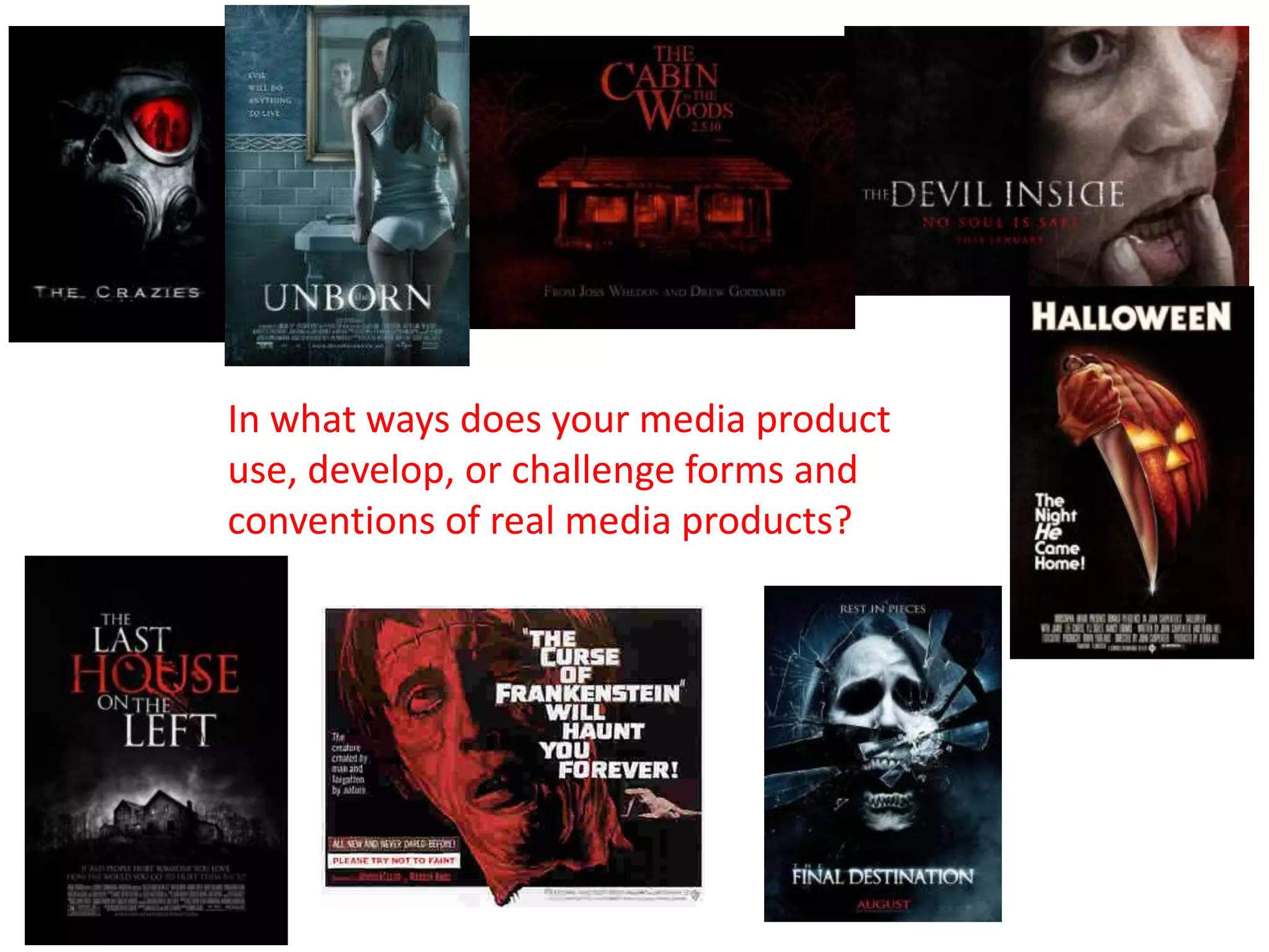 The document discusses conventions used in horror film trailers, magazines, and posters. It analyzes how the media product uses similar conventions, such as featuring mysterious characters, gore, and progressive music for the trailer. For the magazine, conventions like red/black color schemes, prominent images, and sub-stories are employed. Poster conventions replicated include the prominent title, tagline, related imagery, and ratings/quotes. The goal is to draw in audiences using familiar conventions while promoting the described horror film and media product.