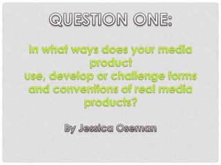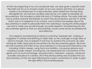 The document discusses the process of creating a 5-minute documentary introduction, radio trail, and TV listings article as part of an A2 coursework task. It outlines the research and planning done to understand conventions of the documentary genre, including watching examples and analyzing techniques used. Elements like interviews, reconstructions, voiceovers and actual footage were included. Camera shots, sound design, narrative structure, and ensuring pieces followed industry conventions were also focuses of the process.