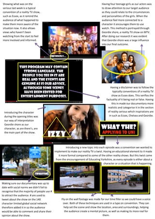 This document discusses conventions used in reality television shows that were implemented in a student documentary project. It describes including a disclaimer to verify the factual nature of the content, introducing characters in the opening titles to emulate shows like Geordie Shore, and adding hashtags to encourage audience engagement on social media, as reality TV viewers often discuss shows online. The purpose of these conventions was to make the student documentary feel authentic and connect with its target teenage audience.