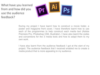 The document discusses how the author used audience feedback to inform their media project. They sent out a questionnaire at the beginning of their project to get feedback on the proposed movie genre, title, and whether it should have a happy or sad ending. Most respondents preferred a romantic comedy genre, liked the proposed title, and wanted a happy ending. However, the author decided to end the trailer ambiguously to generate more interest. The audience feedback helped the author tailor their project to appeal to their target demographic of 16-18 year old females.